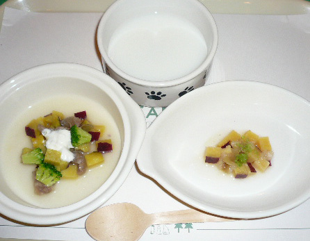 メニューは、ぎゅうにくとさつまいもとブロッコリーのミルクにと、りんごとさつまいものはちみつにと、ヤギミルク。